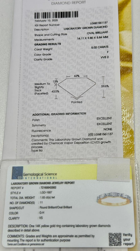 14KT 5.02CTW Yellow Gold Lab Diamond Rings -IGI Certified